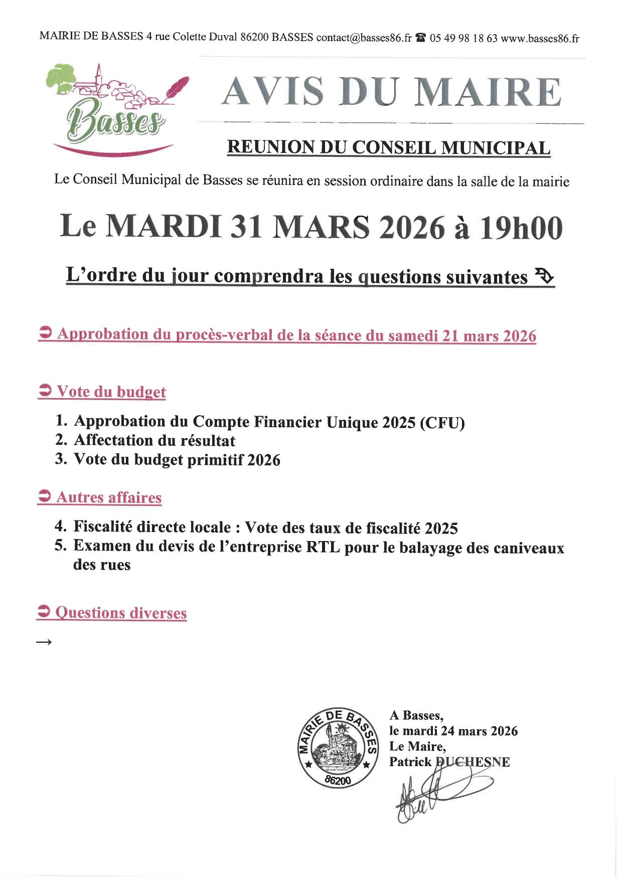 3. Avis Maire – prochain Conseil Municipal