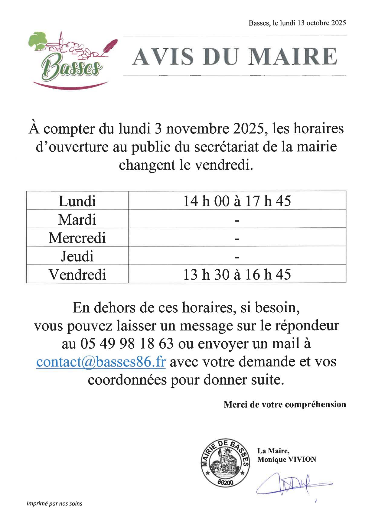 Nouveaux horaires ouverture secrétariat vendredi